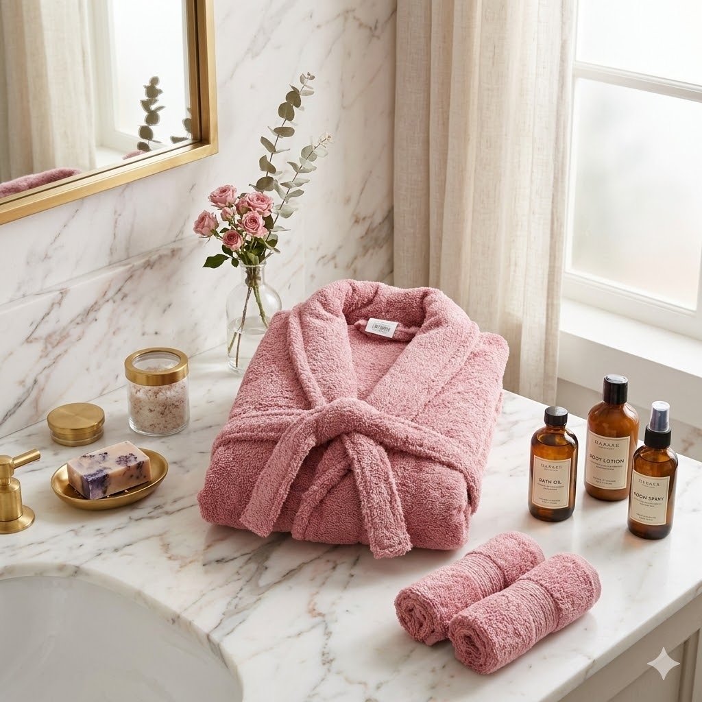 Les accessoires présents sur le visuel ne sont pas vendus avec le peignoir.