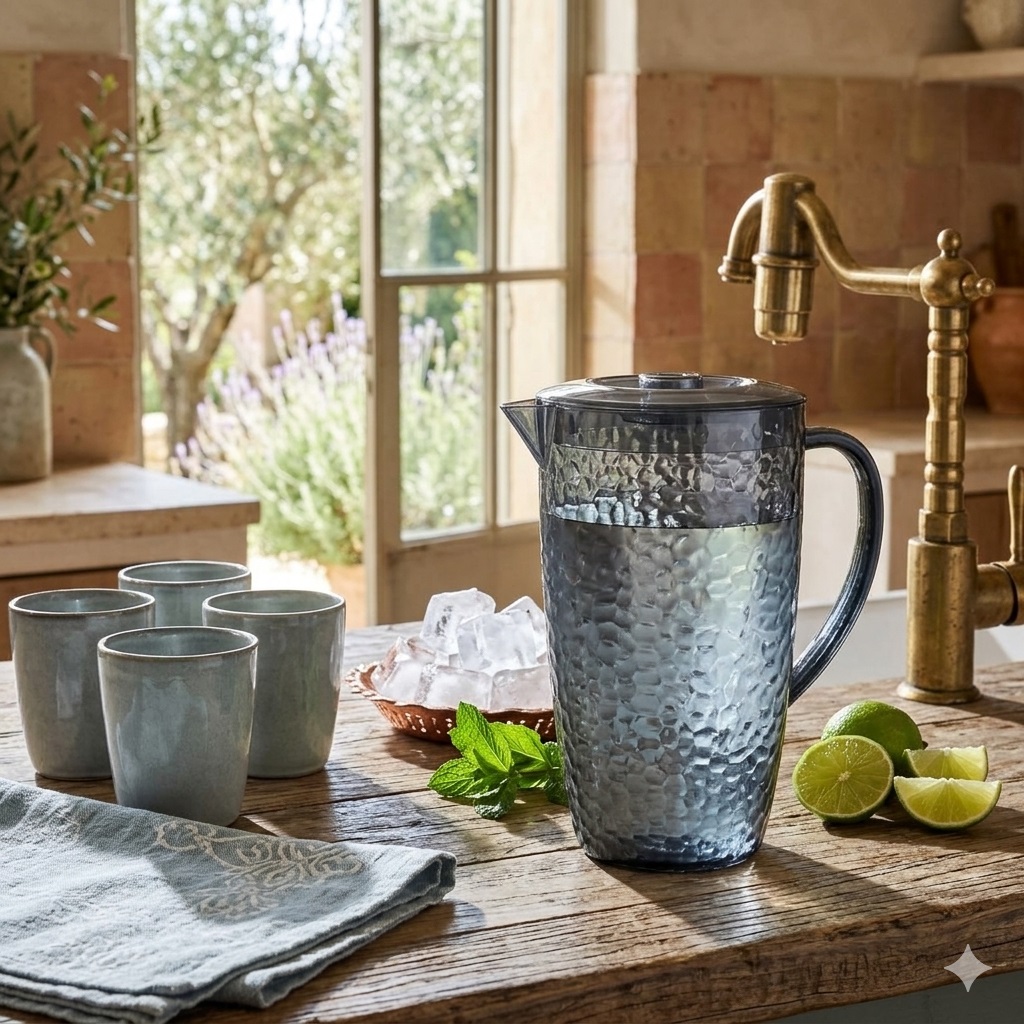 Apportez une touche moderne et rafraîchissante à vos tables avec ce pichet au design effet martelé bleu pétrole, idéal pour vos repas d’été et moments conviviaux.