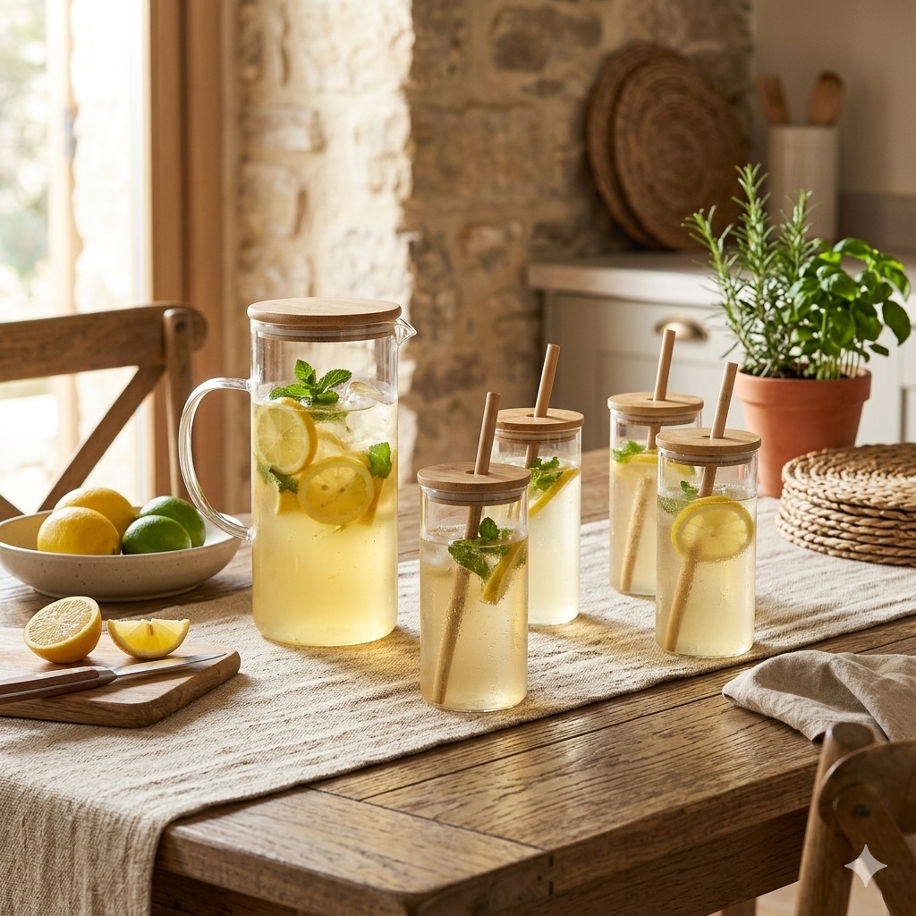 Idéal pour citronnades, thés glacés ou cocktails maison, cet ensemble complet comprend une carafe élégante et 4 chopes avec couvercles et pailles réutilisables.