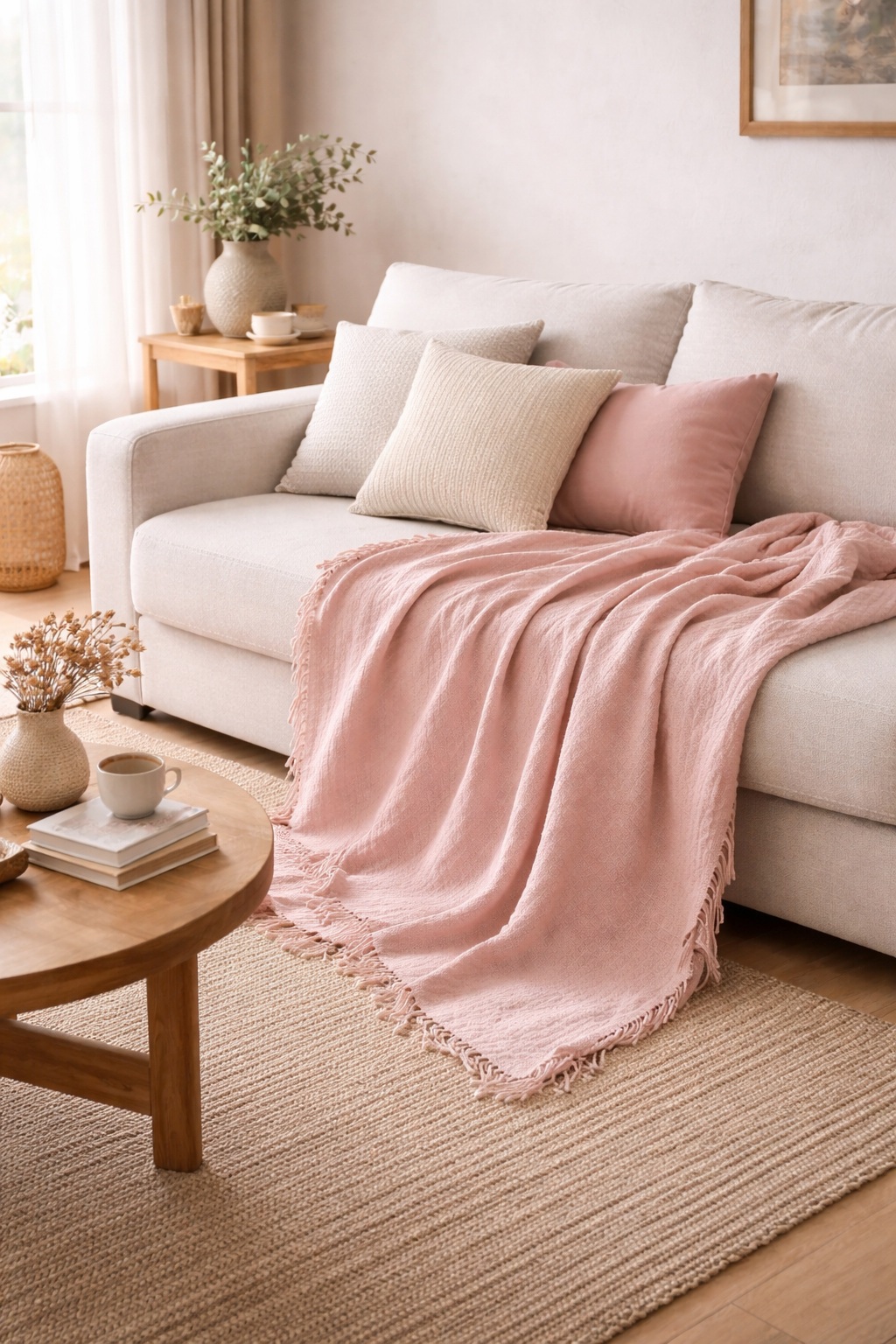 Sa composition 100 % coton – 220 g/m² garantit une belle tenue dans le temps tout en conservant une sensation de souplesse et de chaleur agréable. Sa teinte rose poudré, délicate et tendance, s’intègre facilement dans tous les styles de décoration, du bohème au contemporain.