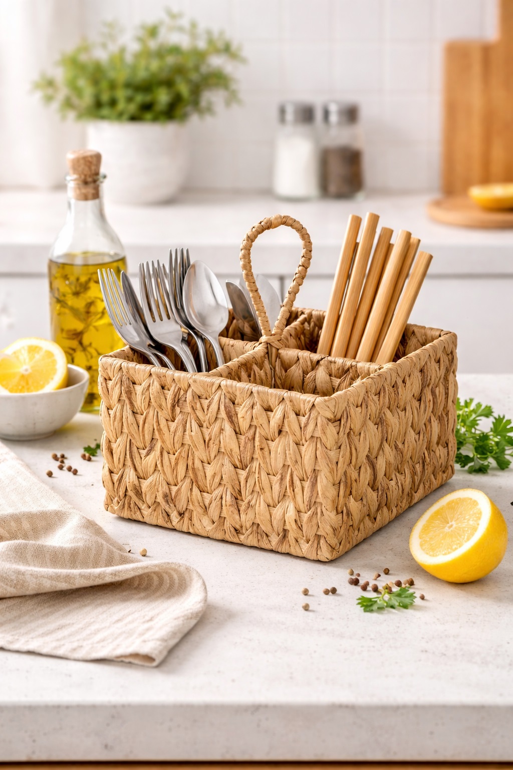 Caractéristiques : • Dimensions : 20 x 20 x 23 cm • Matière : jacinthe naturelle tressée • Couleur : marron • Design naturel et élégant • Idéal pour couverts et ustensiles • Utilisation cuisine, bureau ou extérieur • Léger, pratique et décoratif