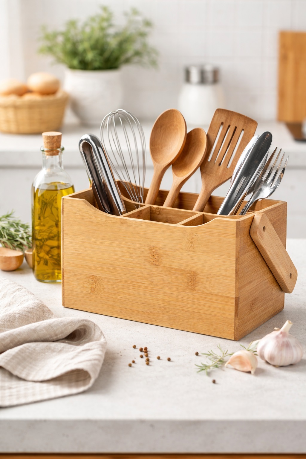 Grâce à ses multiples compartiments, il permet de ranger facilement couverts, ustensiles ou accessoires du quotidien tout en gardant un plan de travail propre et ordonné.
