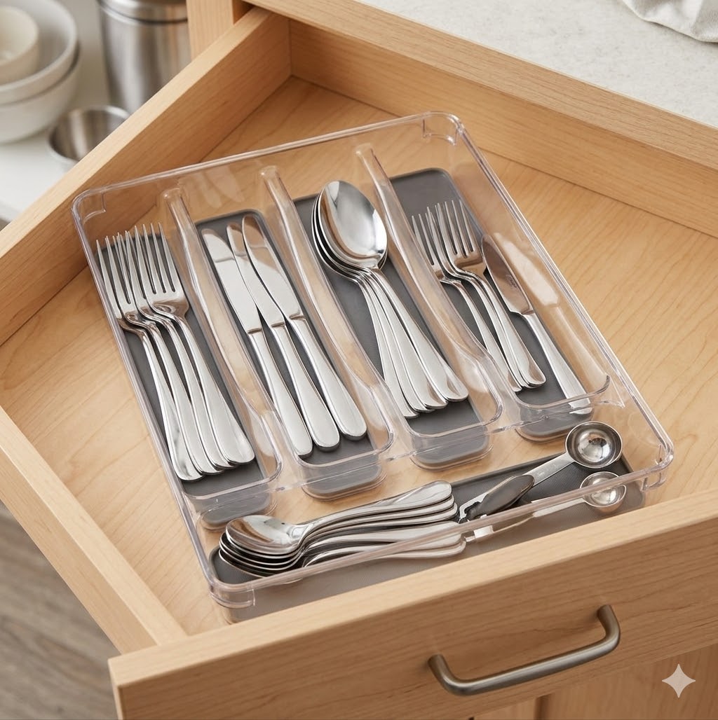 Accueil → CUISINE → Range couverts Range couverts 5 compartiments en plastique transparent 7,26€ Dont Eco-participation :0,19€ Produit en stocklivré sous (2 jours) Quantité: Description Range couverts 5 compartiments avec des bandes Anti-dérapant avec lui tout s'aligne bien En PVC Dimension: L.32.5 x l.23 cm L'avis des Clients Pas de note client (Mettre un commentaire en premier) Commentaires Votre avis ?