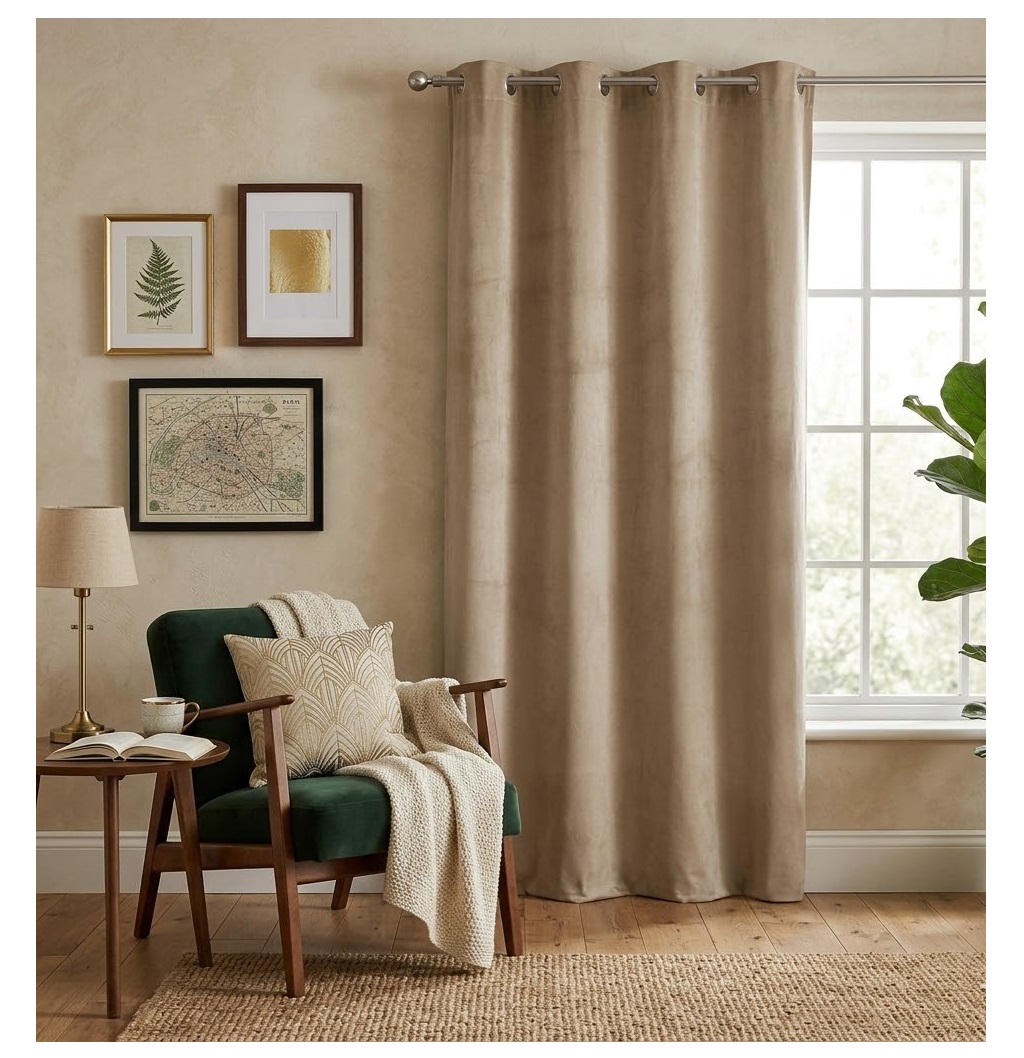 Conçu en 100% polyester effet velours, ce rideau est à la fois résistant, doux au toucher et simple à entretenir.