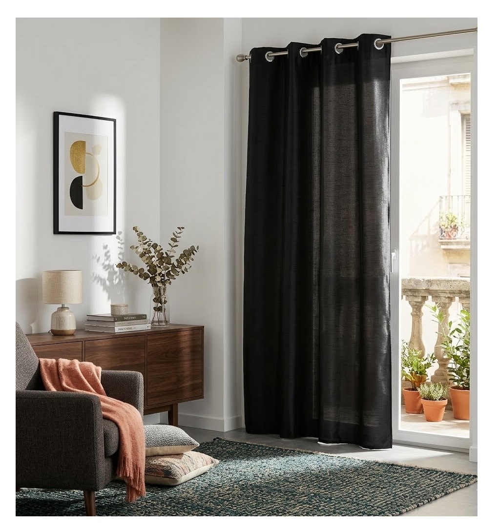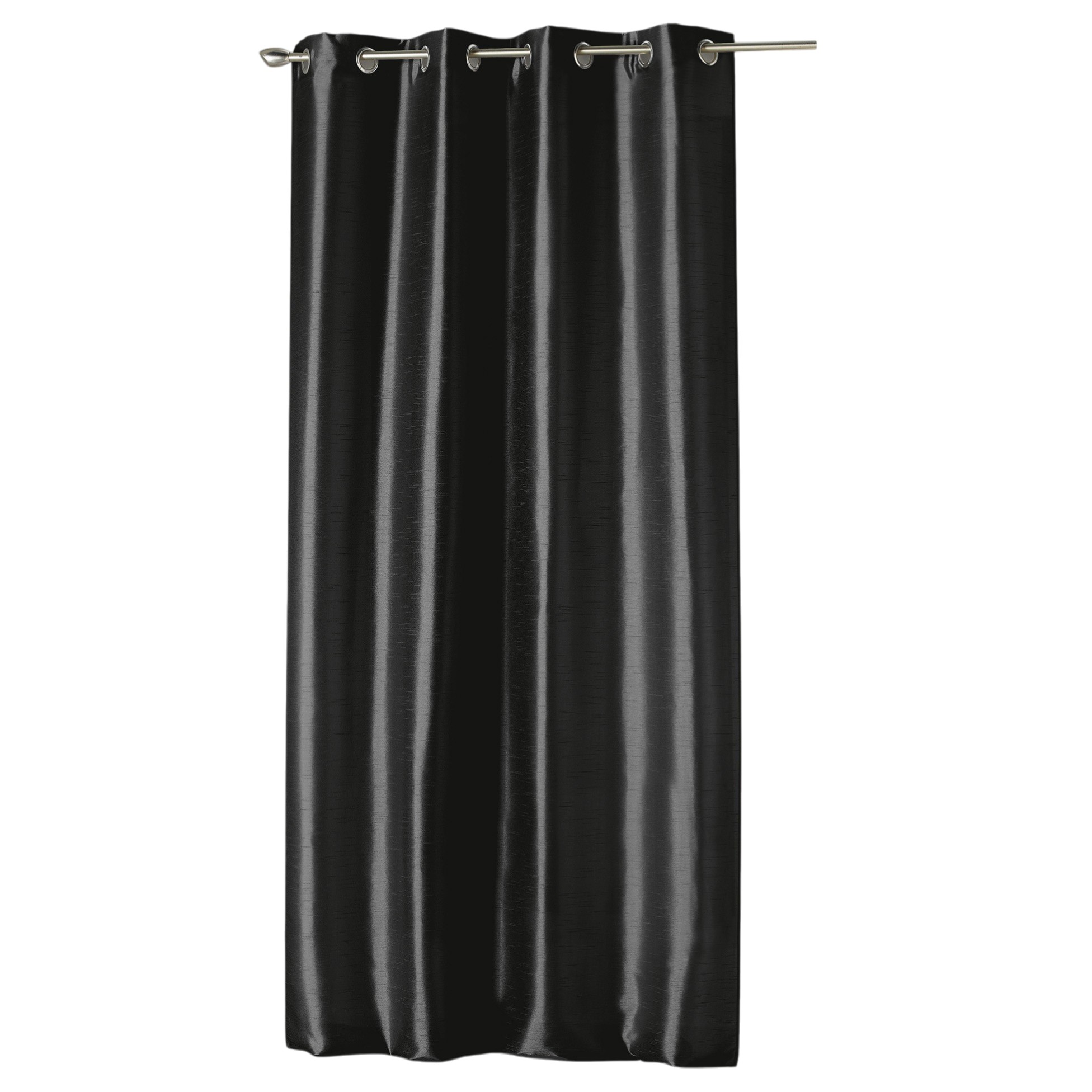 • Modèle : rideau Shantung Shana • Dimensions : 140 x 240 cm • Couleur : noir • Matière : 100 % polyester • Texture : effet shantung soyeux et légèrement brillant • Finition : 8 œillets métal (diamètre 4 cm) • Installation : prêt à poser • Entretien : lavage en machine à 30° séparément, cycle doux