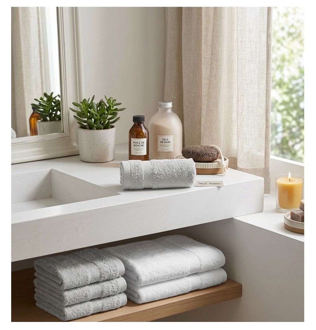 • Dimensions : 30x50 cm • Matière : 100 % coton • Grammage : 600 g/m² (épais et absorbant) • Coloris : gris perle • Certification : Oeko-Tex® (sans substances nocives)