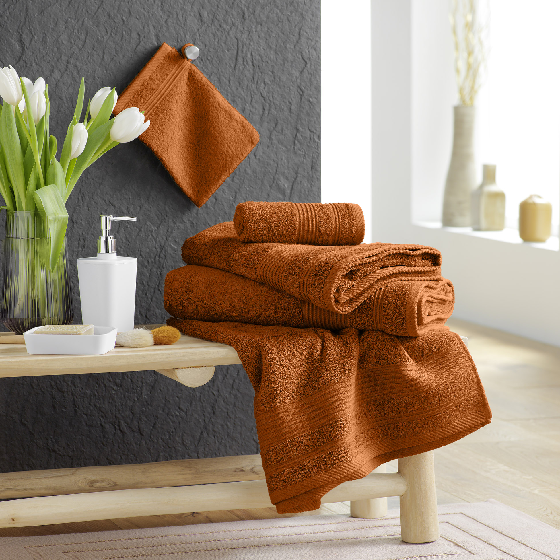 Pour une décoration harmonieuse, complétez votre linge de bain avec les gants de toilette, tapis de douche, rideaux de douche et accessoires assortis de la collection.