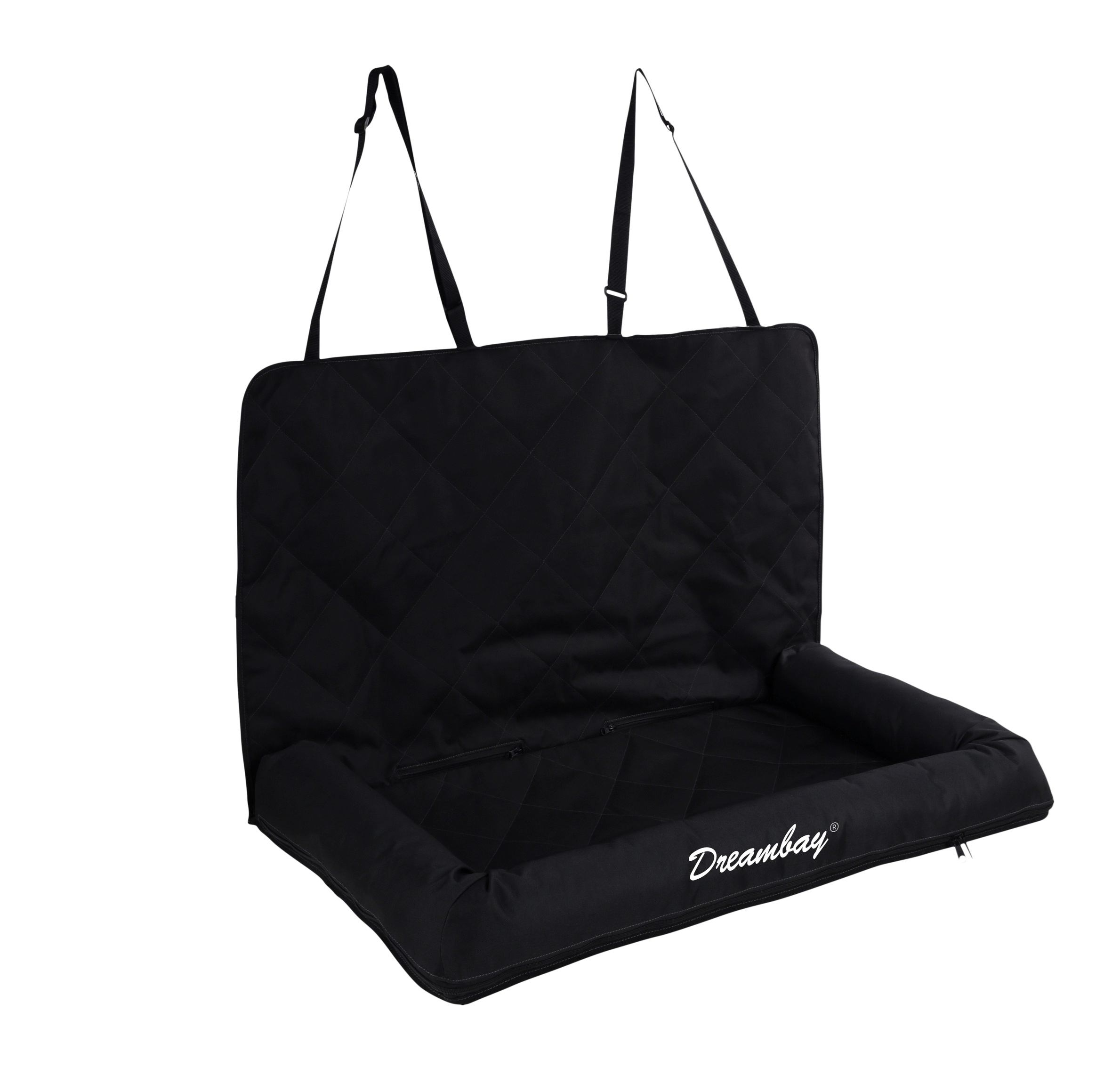 Siège auto pour chien Dreambay destiné à la banquette arrière du véhicule. Conception en polyester déperlant, avec rembourrage en fibre de polyester pour protéger la banquette et offrir une surface confortable à l’animal pendant le transport.