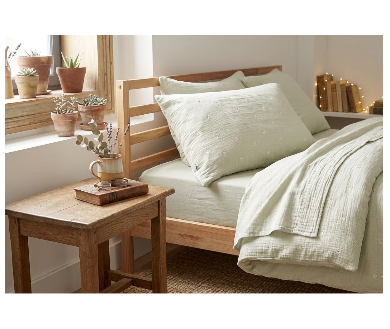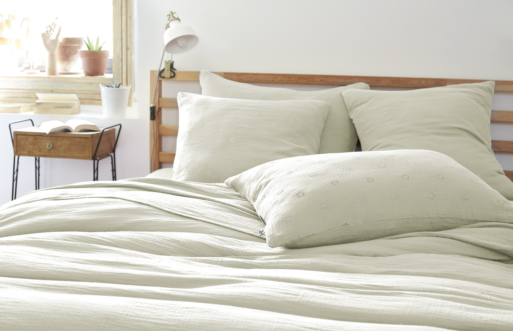Naturellement froissée, la gaze de coton ne nécessite pas de repassage et s’intègre parfaitement dans une décoration bohème ou contemporaine.