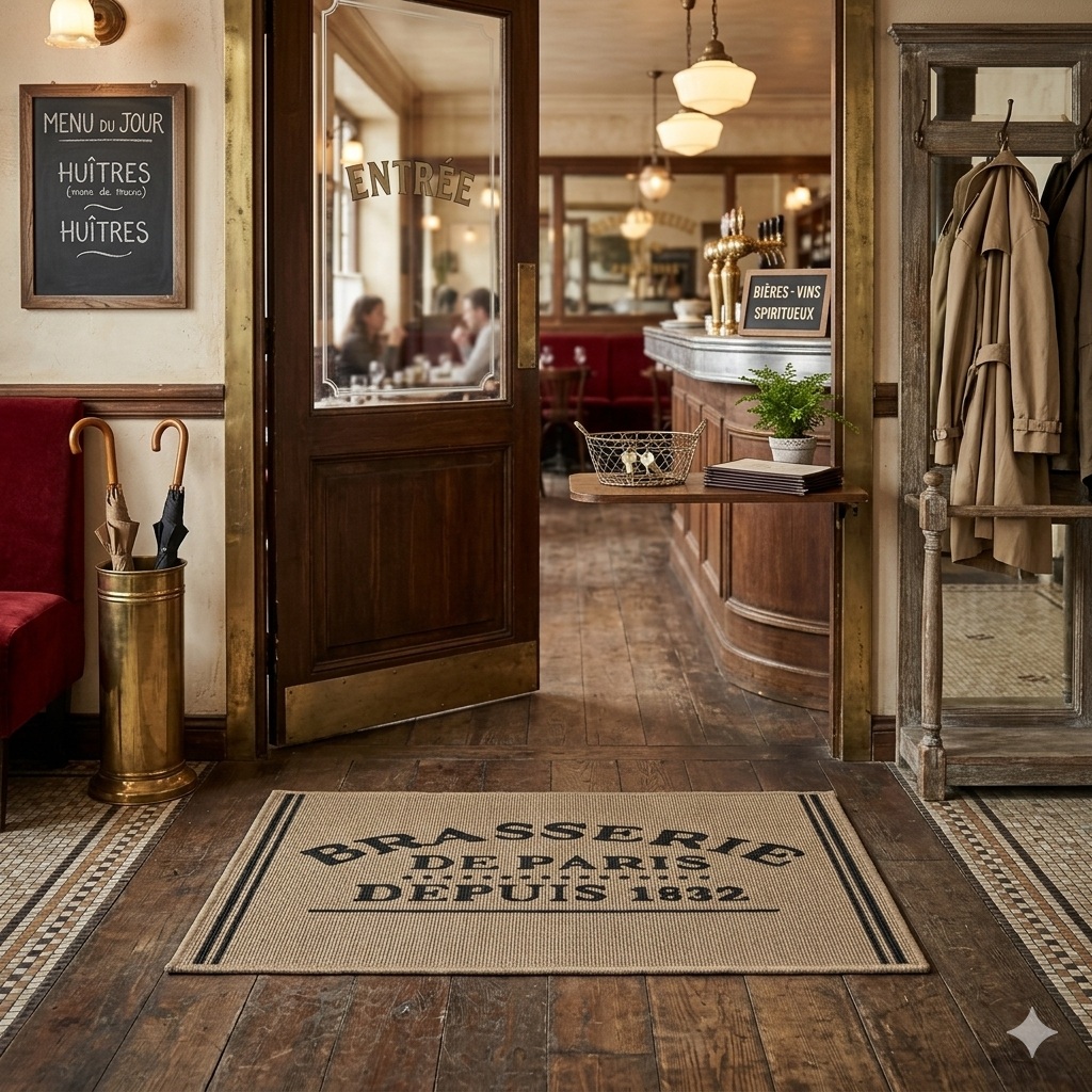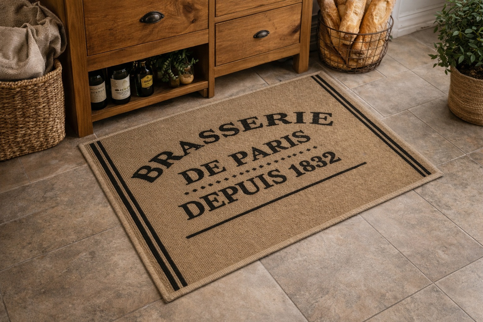 Apportez une touche de charme authentique à votre intérieur avec ce tapis décoratif Brasserie de Paris. Inspiré de l’ambiance chaleureuse des bistrots parisiens, son motif typographique « Brasserie de Paris – Depuis 1832 » apporte un style vintage et élégant à votre cuisine, votre entrée ou votre coin repas.