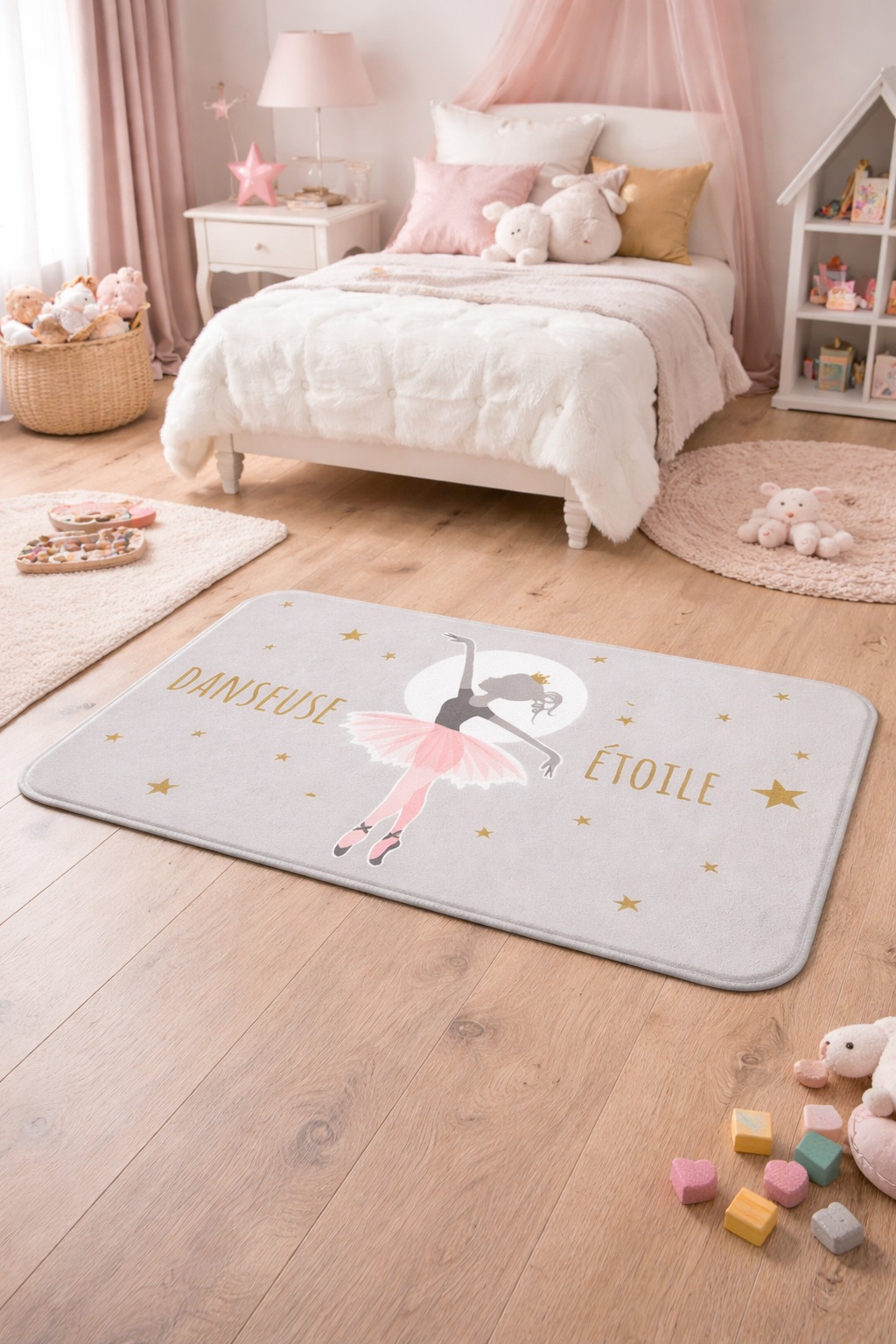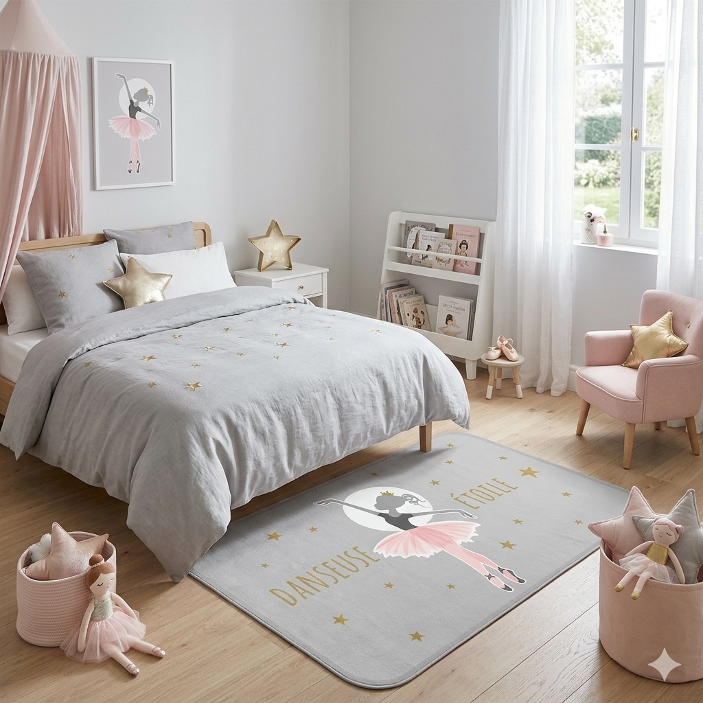 Apportez une touche douce et poétique à la chambre d’un enfant avec ce tapis décoratif au motif danseuse. Son design délicat représentant une ballerine entourée d’étoiles crée une ambiance féerique, idéale pour une chambre de petite danseuse ou un univers plein de rêve.