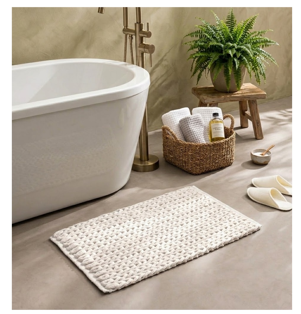 Conçu en coton/polyester avec un effet relief, il offre une texture douce et moelleuse sous les pieds tout en assurant une bonne absorption.