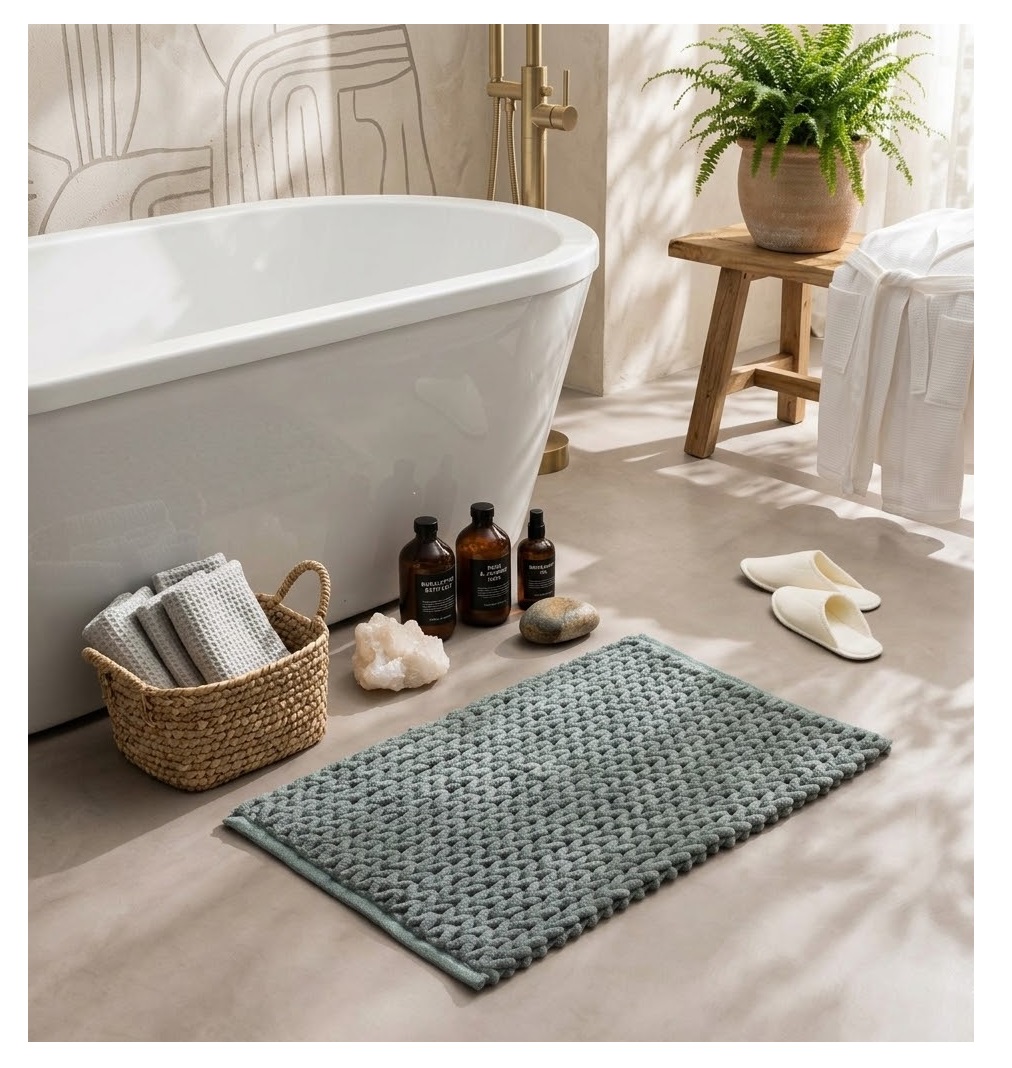 Conçu en coton/polyester avec un effet relief, il offre une texture douce et moelleuse sous les pieds tout en assurant une bonne absorption.