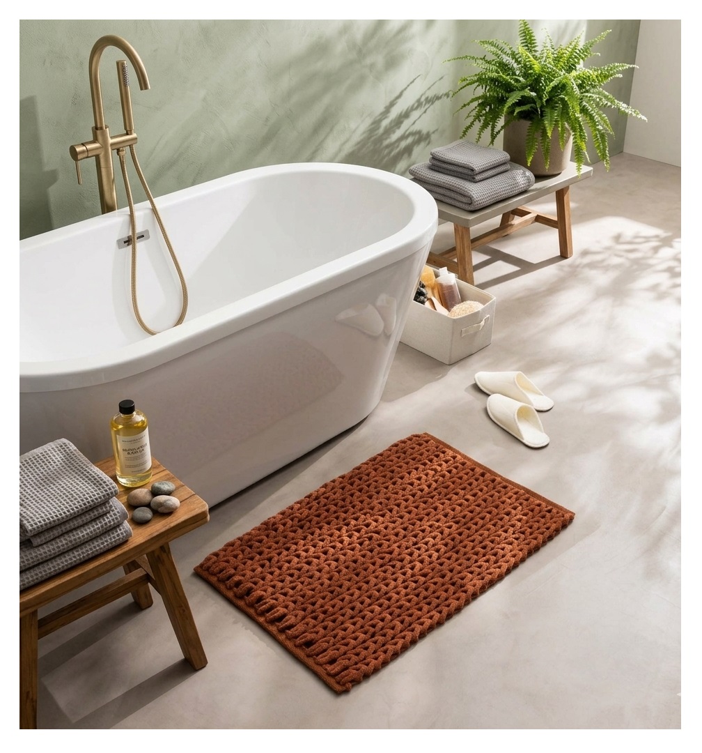 Dimensions : 50 x 80 cm Matière : Coton / Polyester Type : Chenille avec relief Couleur : Terracotta Toucher : Doux et moelleux