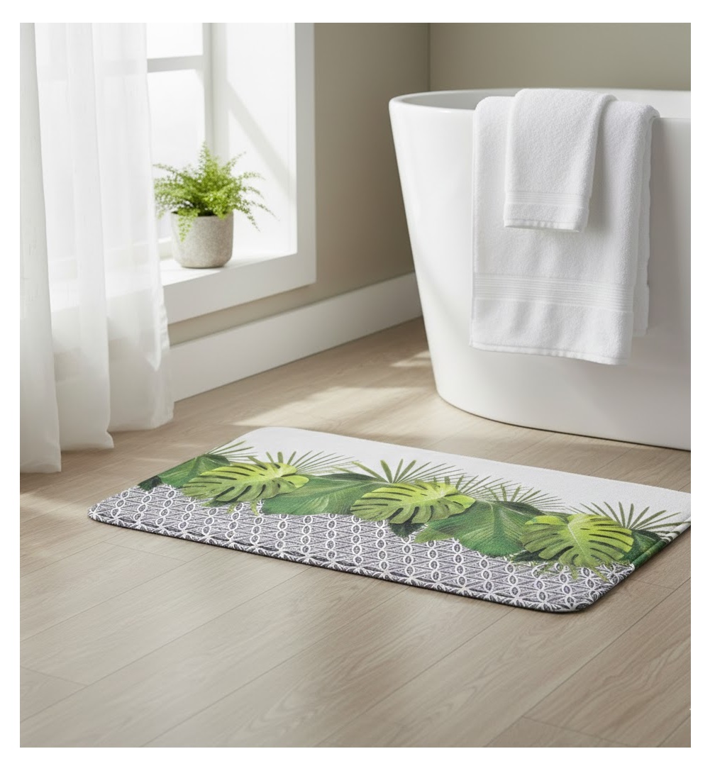 Apportez une ambiance exotique et moderne à votre salle de bain avec ce tapis de bain Jungle en microfibre. Son motif jungle tendance transforme votre salle de bain en un espace naturel et élégant. Fabriqué en 100 % polyester microfibre, il est doux au toucher, résistant et facile à entretenir. Grâce à son dos antidérapant, il garantit une stabilité parfaite pour plus de sécurité après la douche ou le bain. Avec sa finition biais soignée et ses dimensions de 45 x 75 cm, il s’adapte facilement à toutes les salles de bain. Un tapis pratique, esthétique et confortable pour sublimer votre quotidien.