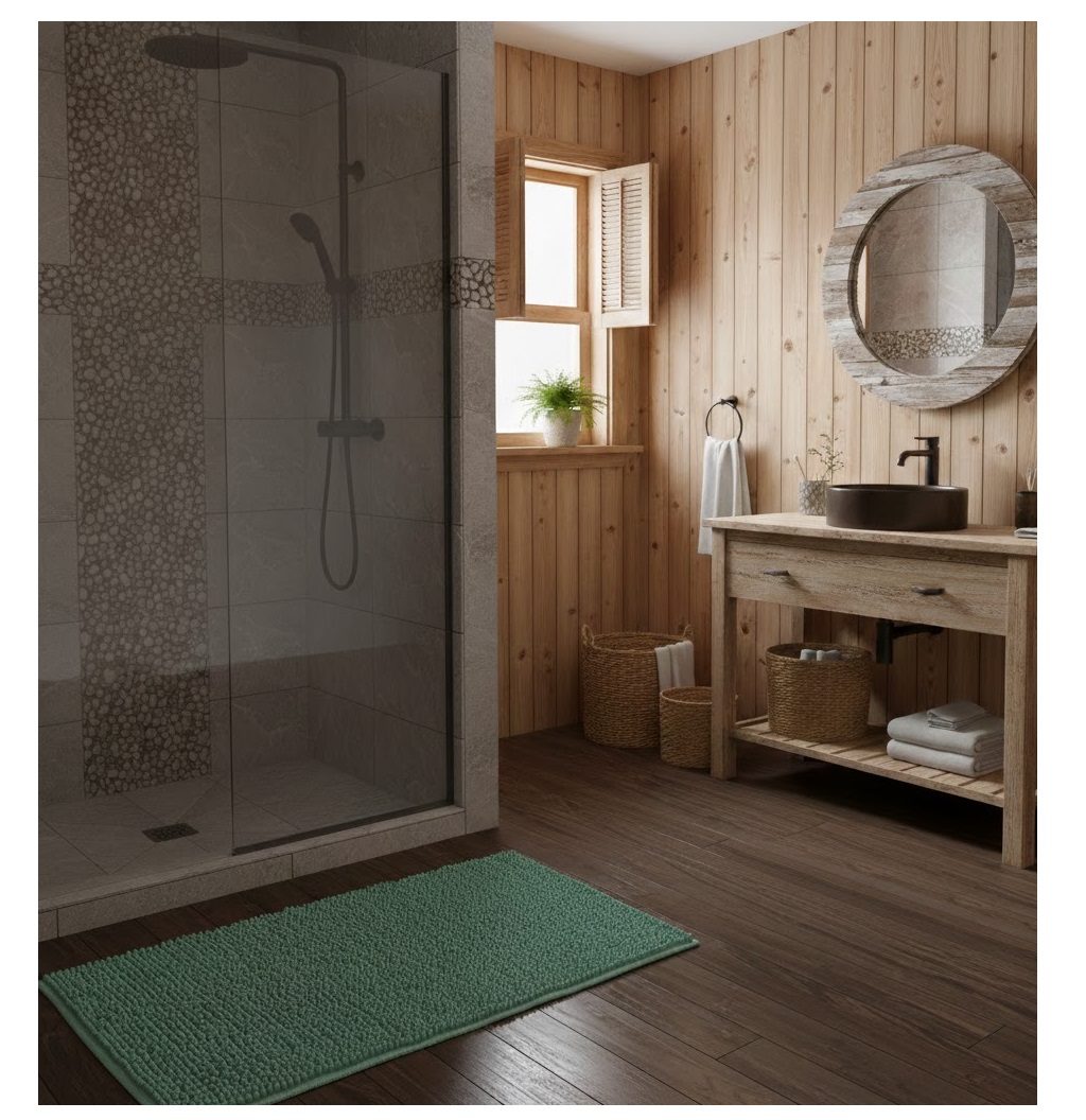 Son grand format 50 x 120 cm est idéal pour habiller l’espace devant une baignoire ou une double vasque. Absorbant et agréable au quotidien, il combine style et praticité. Sa teinte apporte une ambiance douce et cosy à votre décoration.