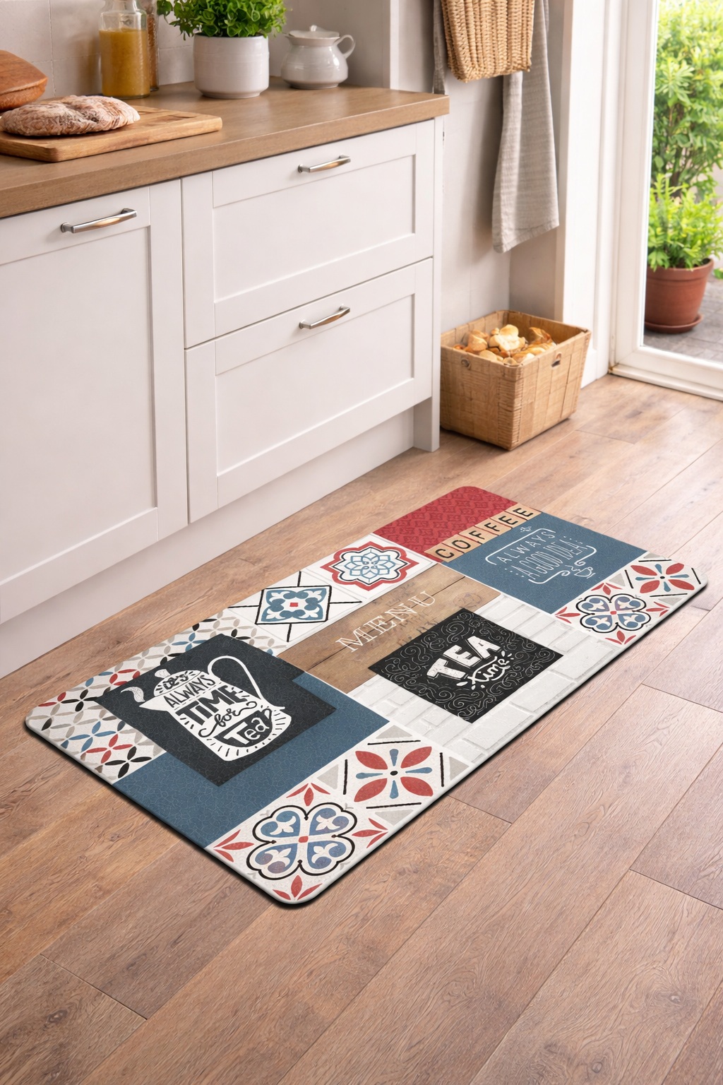 Apportez une touche chaleureuse et conviviale à votre cuisine avec ce tapis de cuisine décoratif au motif Coffee & Tea. Son design original mêlant motifs carreaux de ciment, illustrations et messages gourmands crée une ambiance accueillante, parfaite pour un espace cuisine moderne ou vintage.