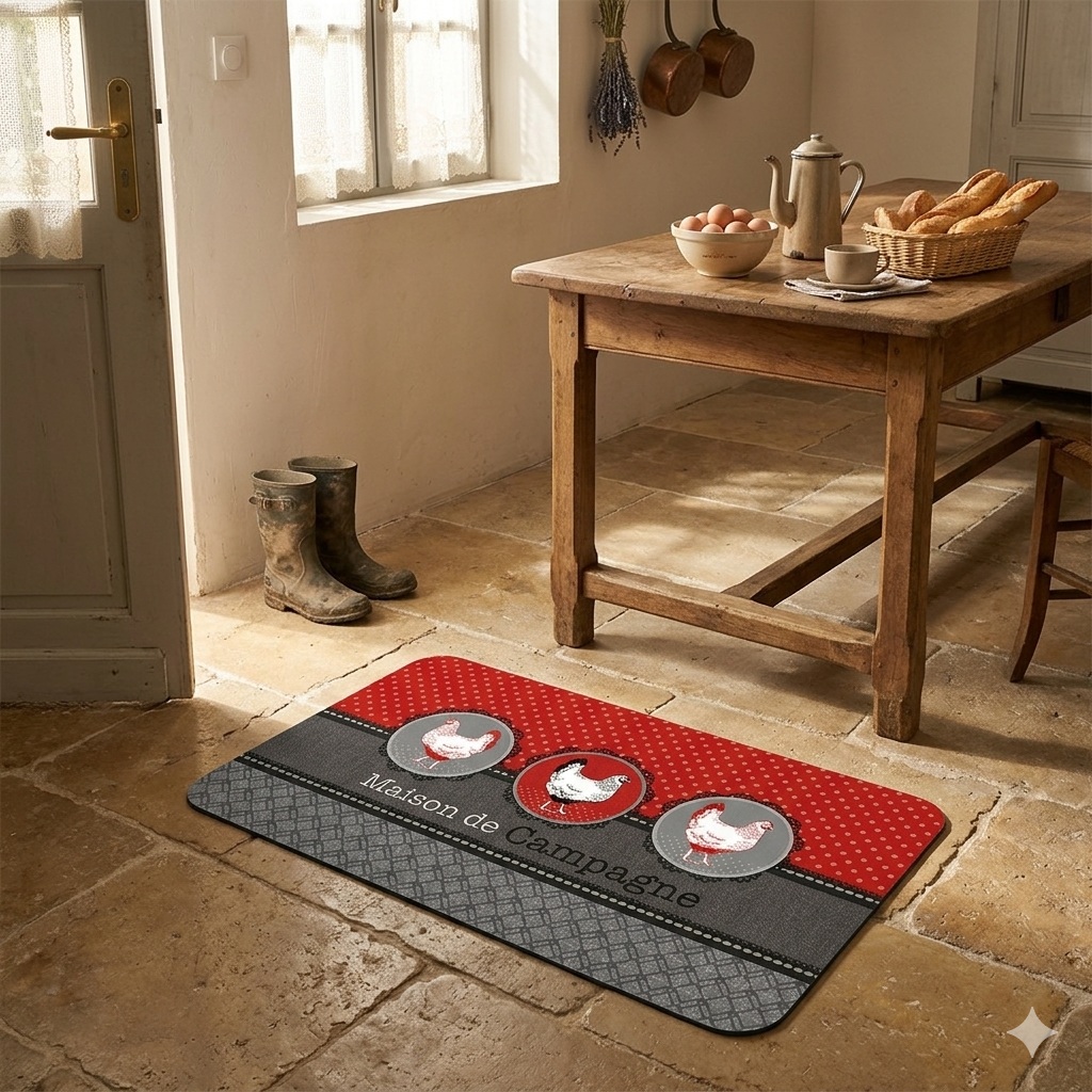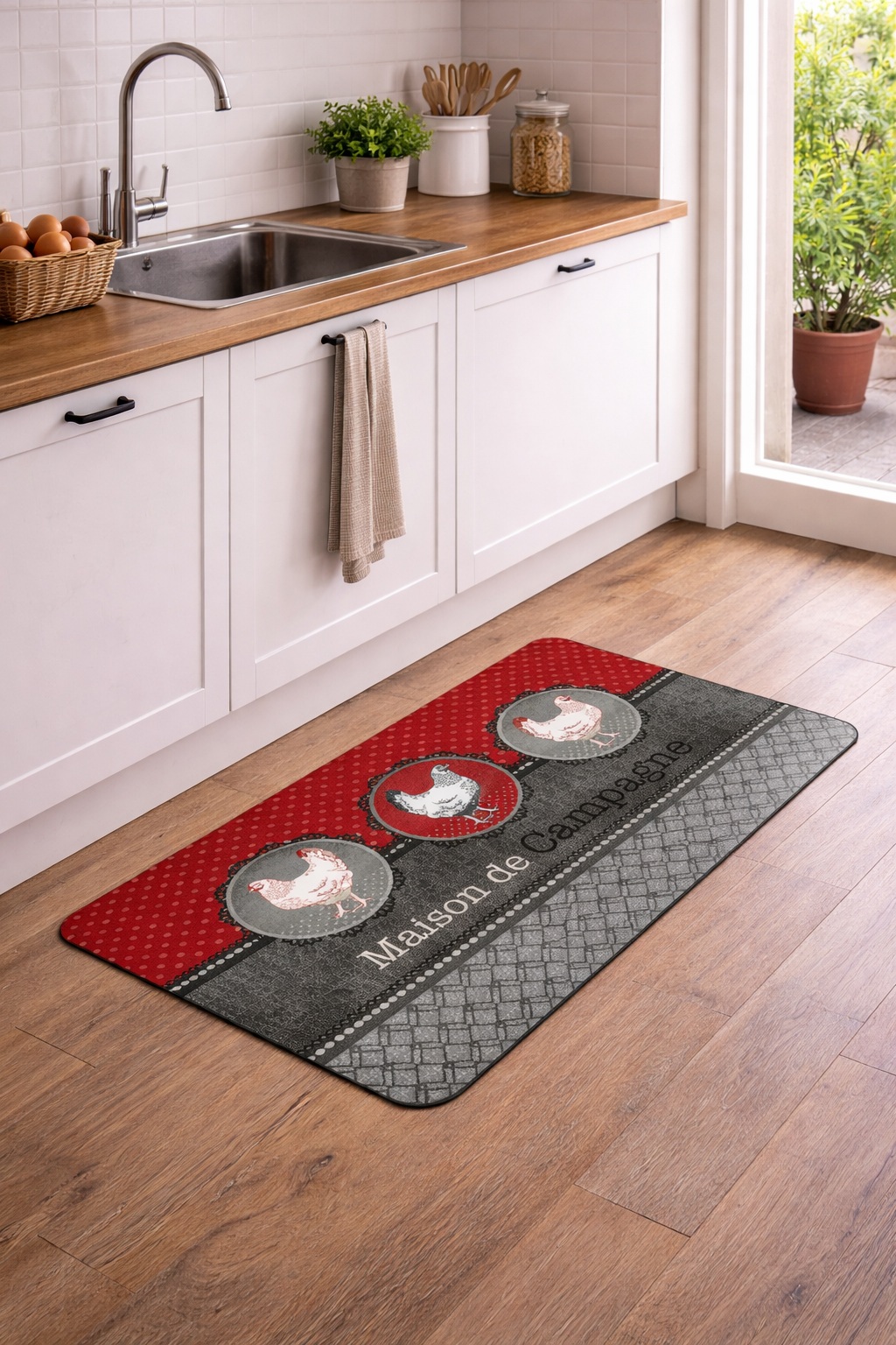 Apportez une touche chaleureuse et authentique à votre cuisine avec ce tapis décoratif motif poules « Maison de Campagne ». Son design rouge et gris aux accents champêtres crée une ambiance conviviale et rustique, idéale pour une cuisine au style campagne ou maison de famille.