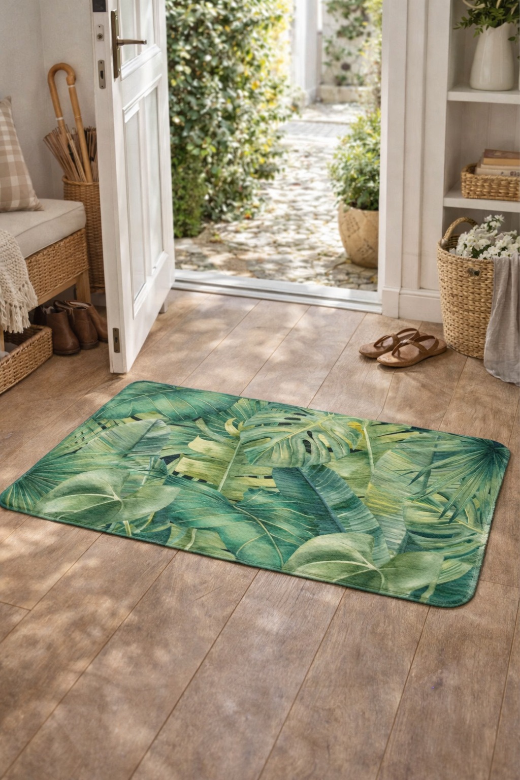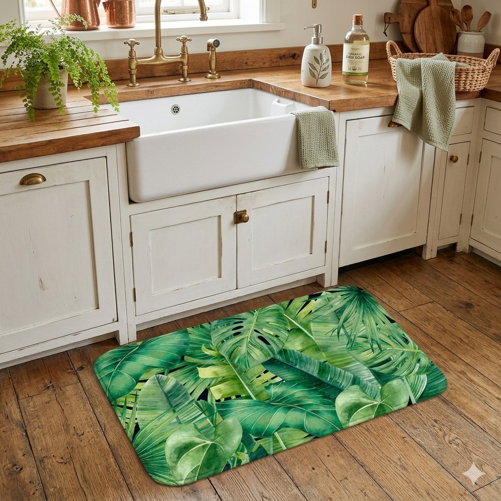 Apportez une touche de nature et d’élégance à votre intérieur avec ce tapis décoratif au motif feuillage tropical. Son design végétal aux différentes nuances de vert crée une ambiance fraîche et apaisante, idéale pour sublimer une entrée, une cuisine ou une chambre.