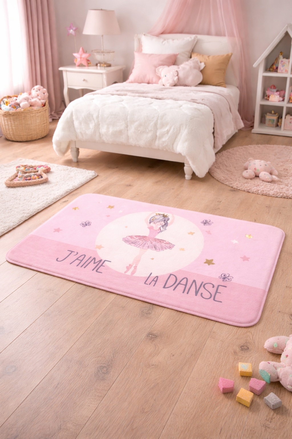 Avec ses tons roses doux et ses détails dorés, ce tapis s’intègre parfaitement dans une décoration enfantine et apporte une note élégante et chaleureuse à l’espace. Son message « J’aime la danse » ravira les enfants passionnés de danse et de ballet.