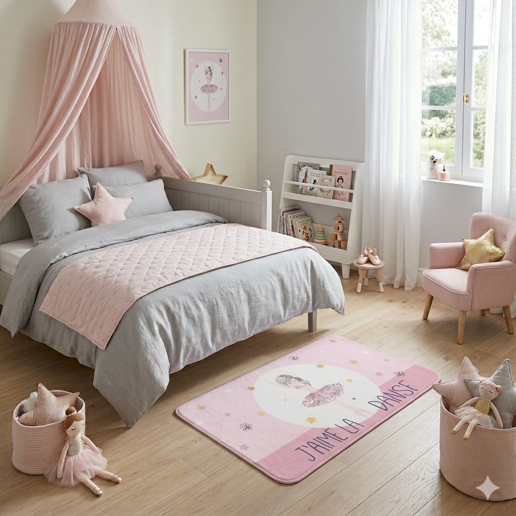 Apportez une touche douce et féerique à la chambre d’une petite danseuse avec ce tapis décoratif au motif ballerine. Son illustration délicate représentant une danseuse entourée d’étoiles et de papillons crée une atmosphère pleine de rêve et de poésie, idéale pour une chambre d’enfant.