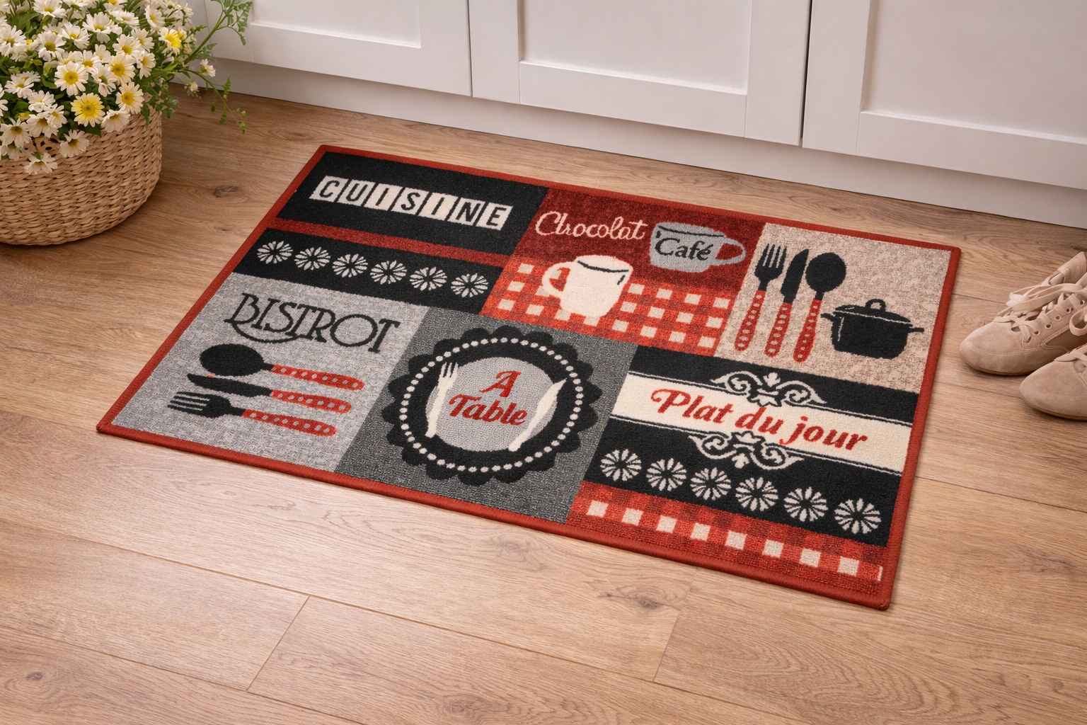 Avec son style bistrot et ses couleurs contrastées rouge, noir et beige, il trouvera facilement sa place dans une cuisine, devant un plan de travail, un évier ou même à l’entrée de la maison.