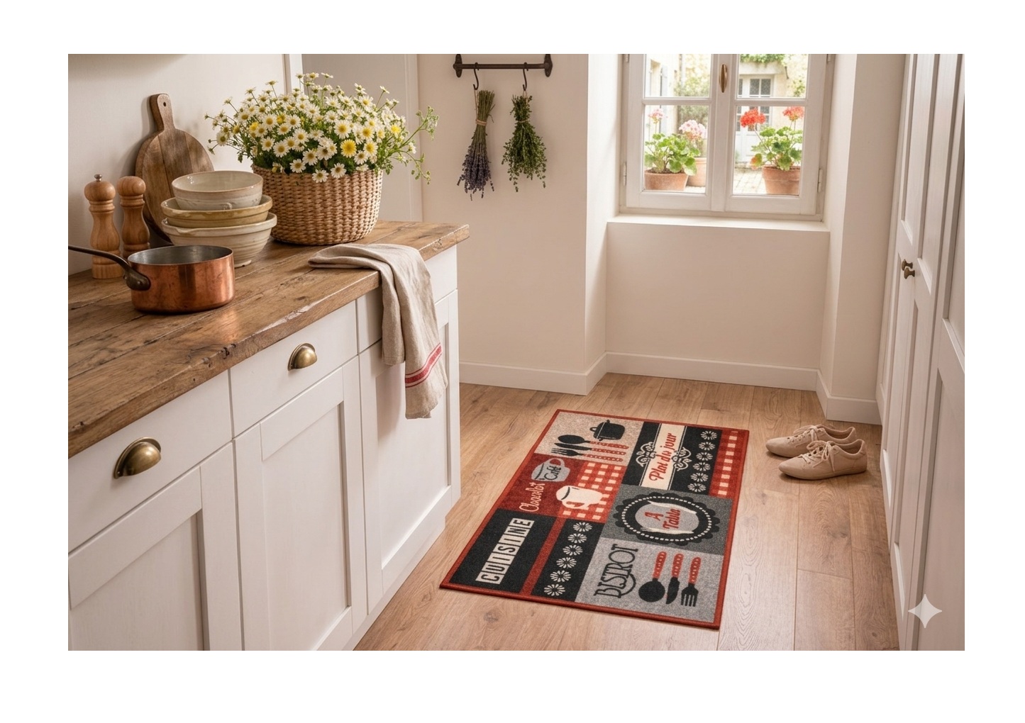 Apportez une touche conviviale et gourmande à votre intérieur avec le tapis d’entrée Menu du jour. Son design inspiré des bistrots et cafés parisiens, avec ses inscriptions et motifs culinaires, crée une ambiance chaleureuse idéale pour une cuisine ou un coin repas.