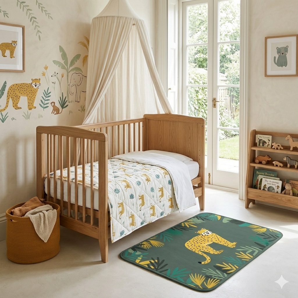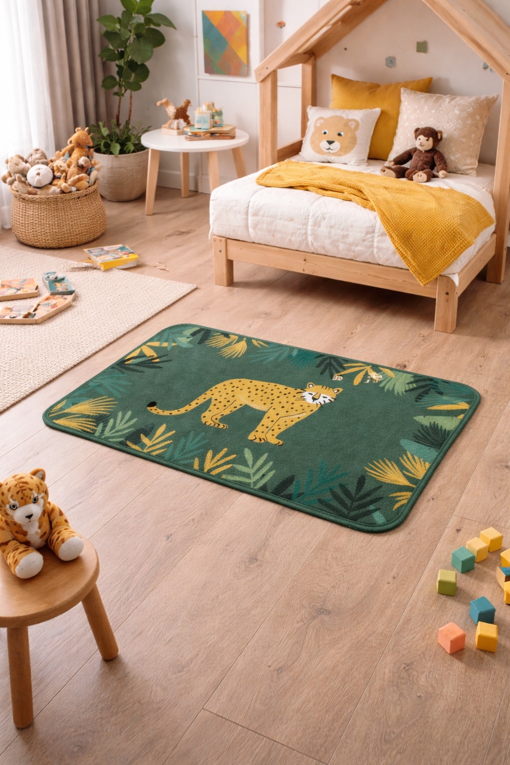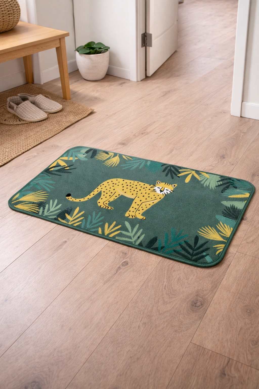 Apportez une touche ludique et exotique à votre intérieur avec ce tapis au motif inspiré de la jungle. Son design original met en scène un élégant félin entouré de feuillages tropicaux, créant une atmosphère chaleureuse et décorative dans une entrée, une chambre ou un espace de jeu.