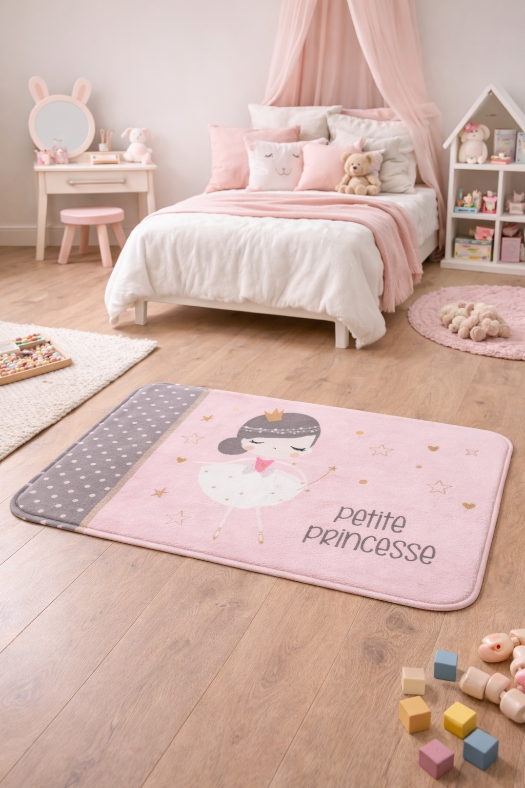 Avec ses couleurs douces rose et gris, agrémentées de détails dorés, ce tapis s’intègre facilement dans une décoration enfantine et apporte une note élégante et chaleureuse à l’espace. L’inscription « Petite Princesse » ajoute une touche adorable qui plaira aux enfants.