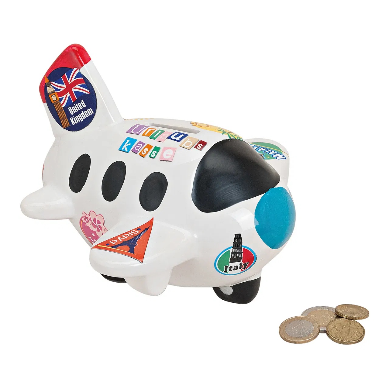 Fabriquée en céramique avec une finition brillante, elle constitue à la fois un objet décoratif original et une tirelire fonctionnelle. Sa fente sur le dessus permet d’insérer facilement pièces et billets, idéale pour une chambre d’enfant ou un espace déco sur le thème du voyage.