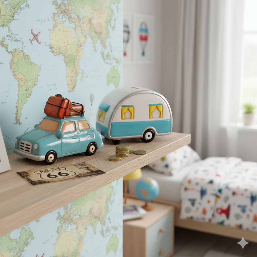 Ce set de tirelires est idéal pour associer épargne, jeu et esprit vacances, tout en apportant une touche déco chaleureuse et originale à une chambre d’enfant ou à un intérieur inspiré du voyage.