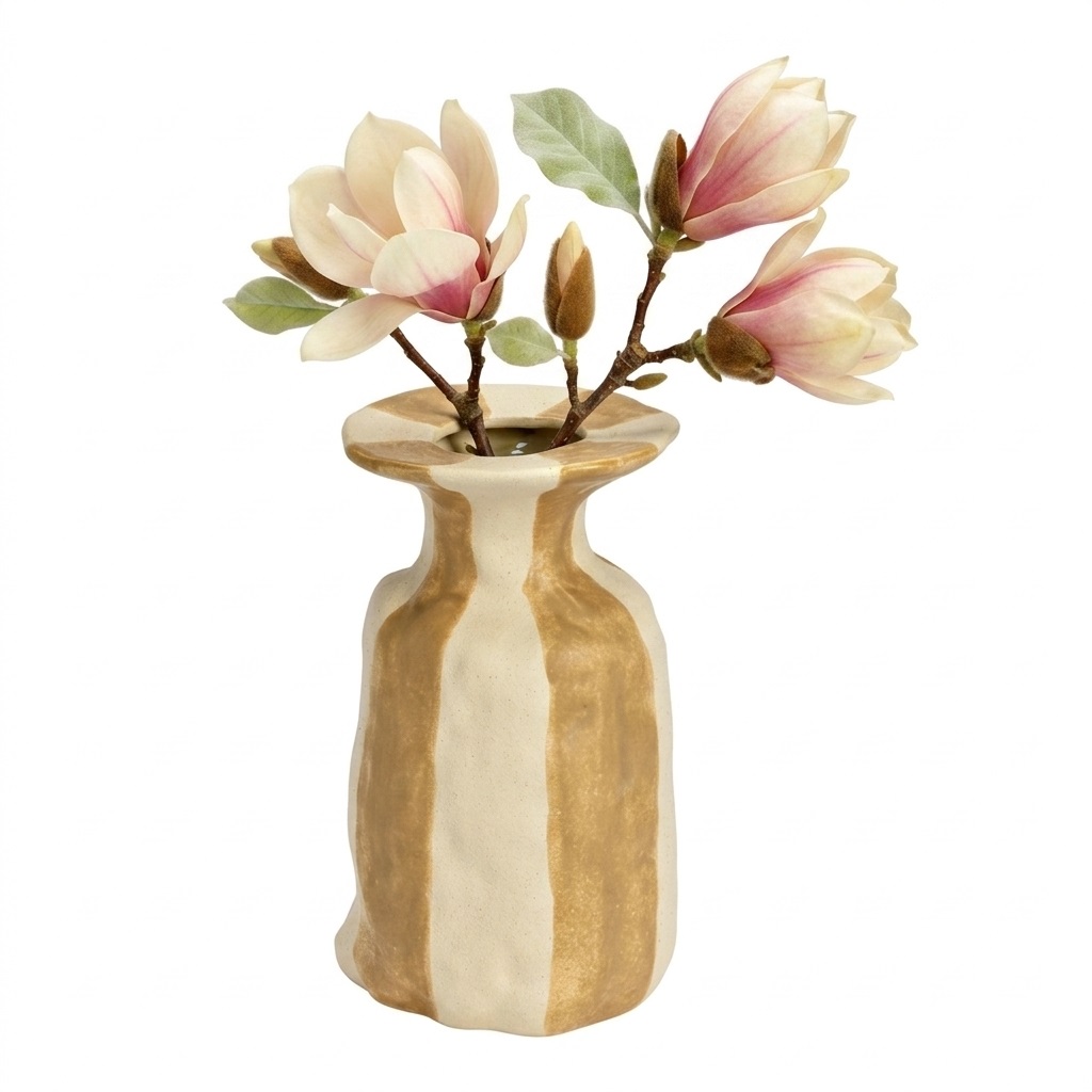 Apportez une touche naturelle et élégante à votre intérieur avec ce vase en céramique à rayures beiges et blanches.