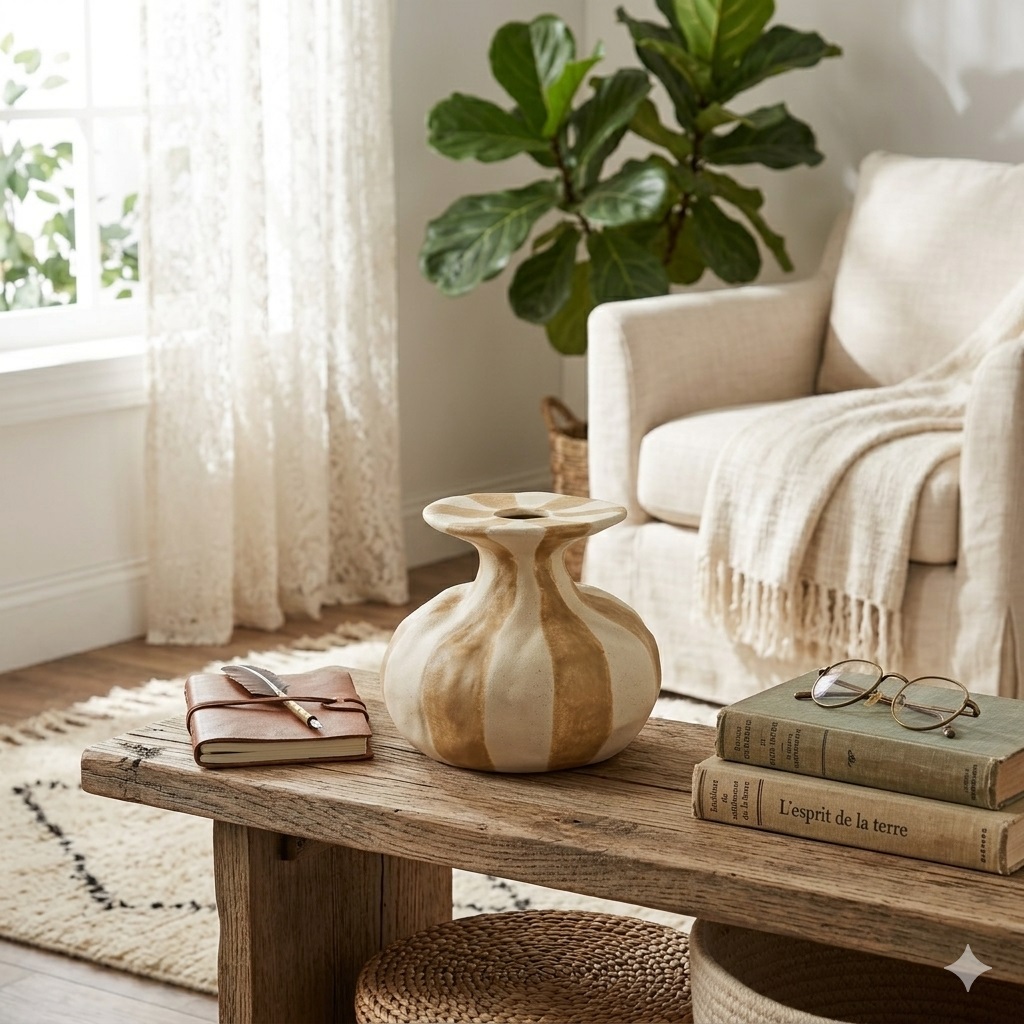 Apportez une touche d’élégance naturelle à votre intérieur avec ce vase en céramique rayé beige et marron.