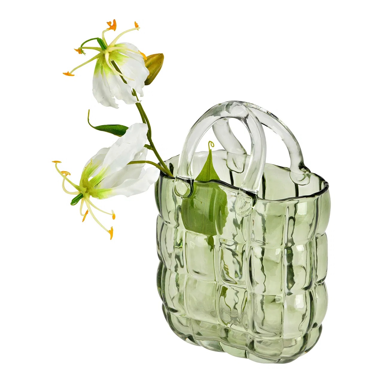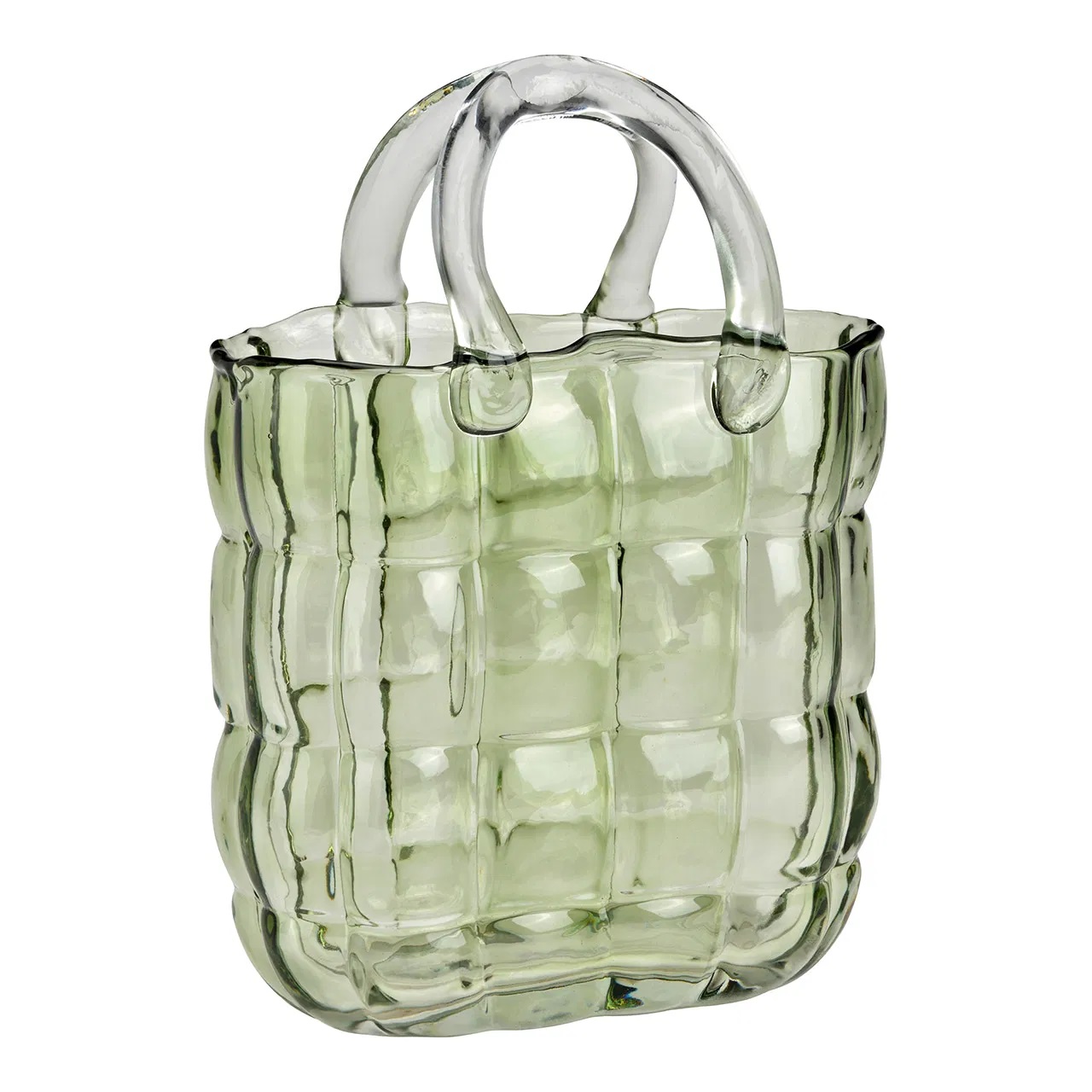Original et résolument design, ce vase en verre vert en forme de sac est une véritable pièce déco qui attire tous les regards. Son relief quadrillé façon matelassé et ses anses transparentes donnent un style unique, à la fois moderne et élégant, parfait pour sublimer une console, une étagère ou une table.