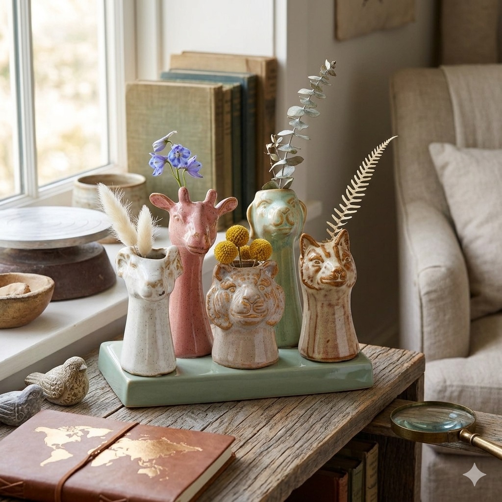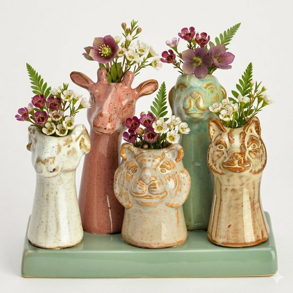 Apportez une touche originale et ludique à votre décoration avec ces vases en faïence ornés de têtes d’animaux, présentés sur un plateau.